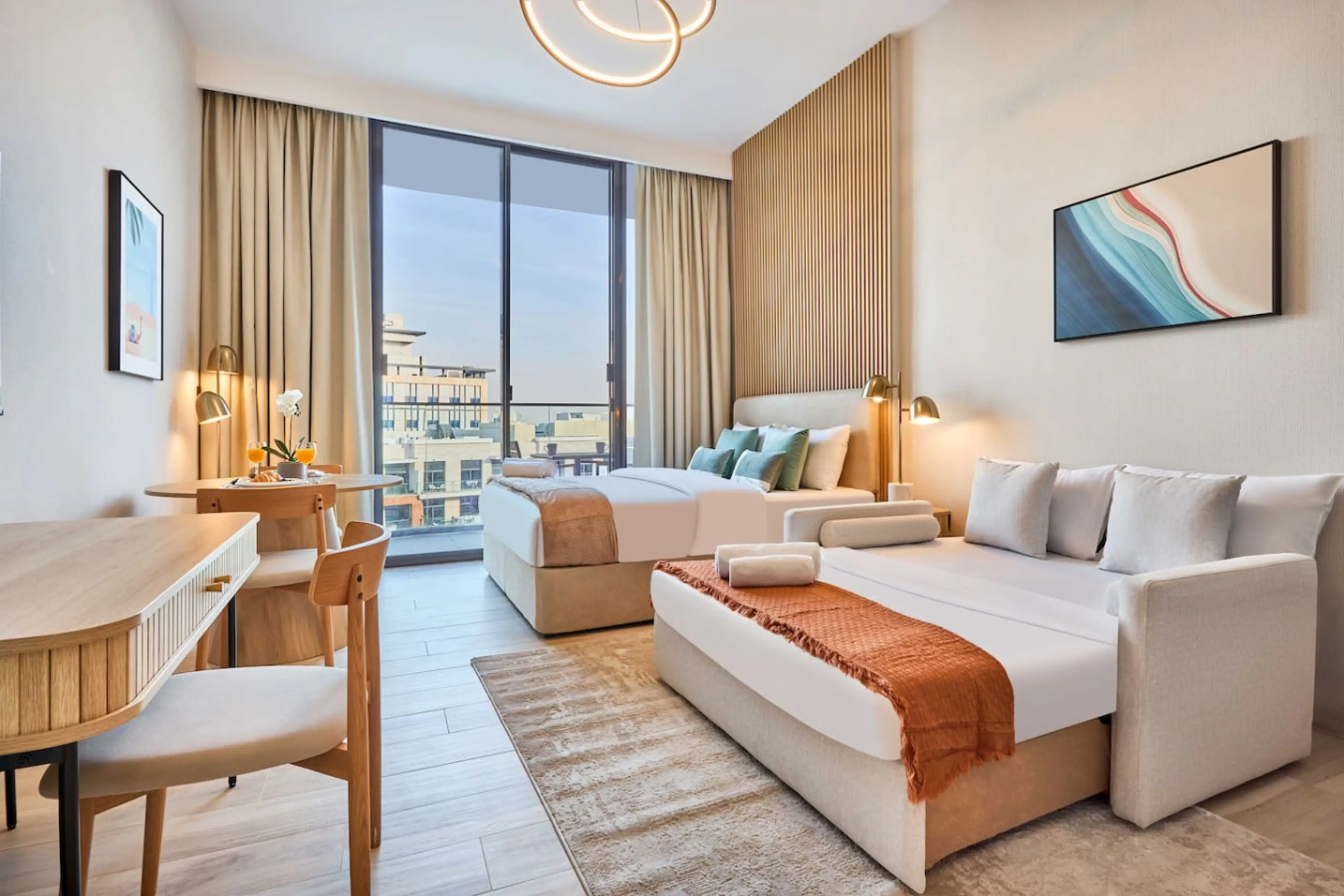 Settle into a warm, well designed studio at Oxford Gardens in Arjan, ideal for couples, solo guests, or business stays 🌿. The open layout includes a comfy bed and sofa bed, a modern bathroom, and a fully equipped kitchen for easy meals 🍳. Enjoy access to the swimming 2 pools, playground, padel cou...